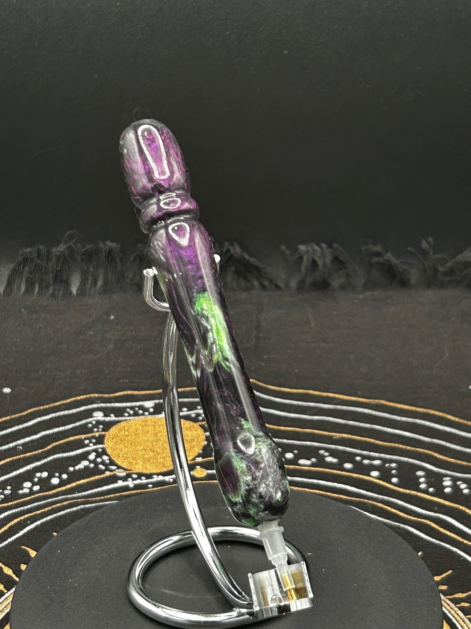 This beautiful pen is an acrylic pen in a lemon purples and neon green swirls. It is approximately 4.5 inches in length. This pen comes in a green velvet pouch, with a tool kit that includes a single place tip, a bent single placer tip, a four-placer tip, and a large row straightener, all nicely placed in a box for shipping