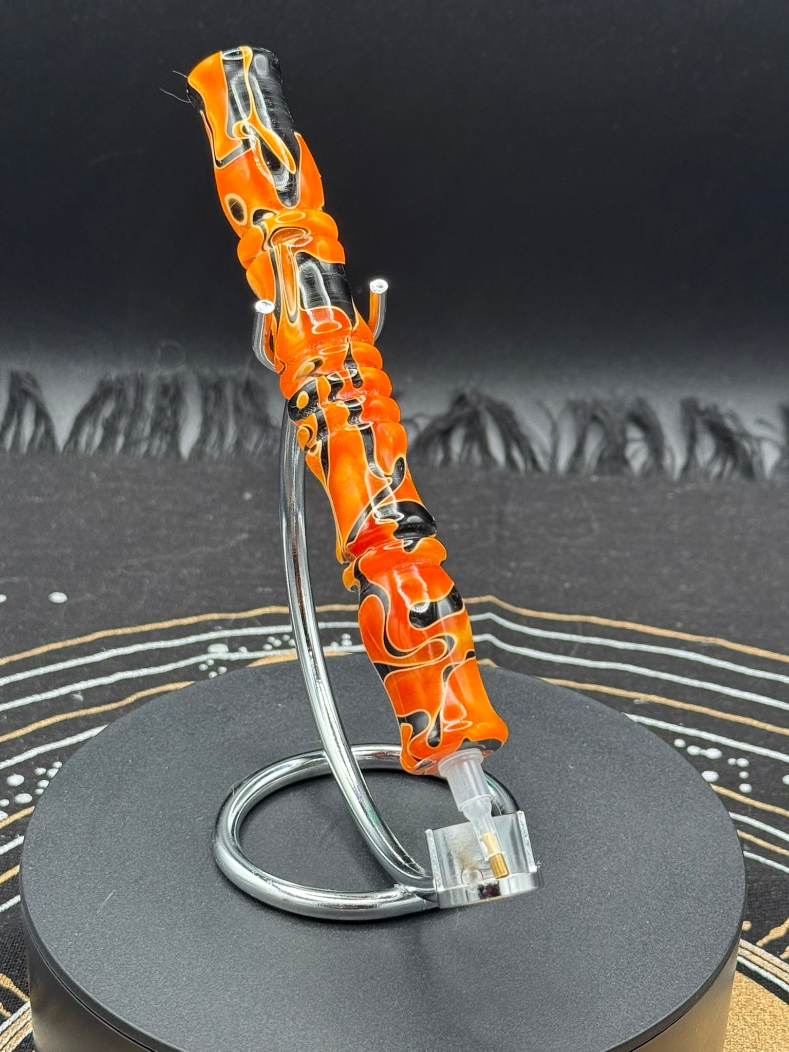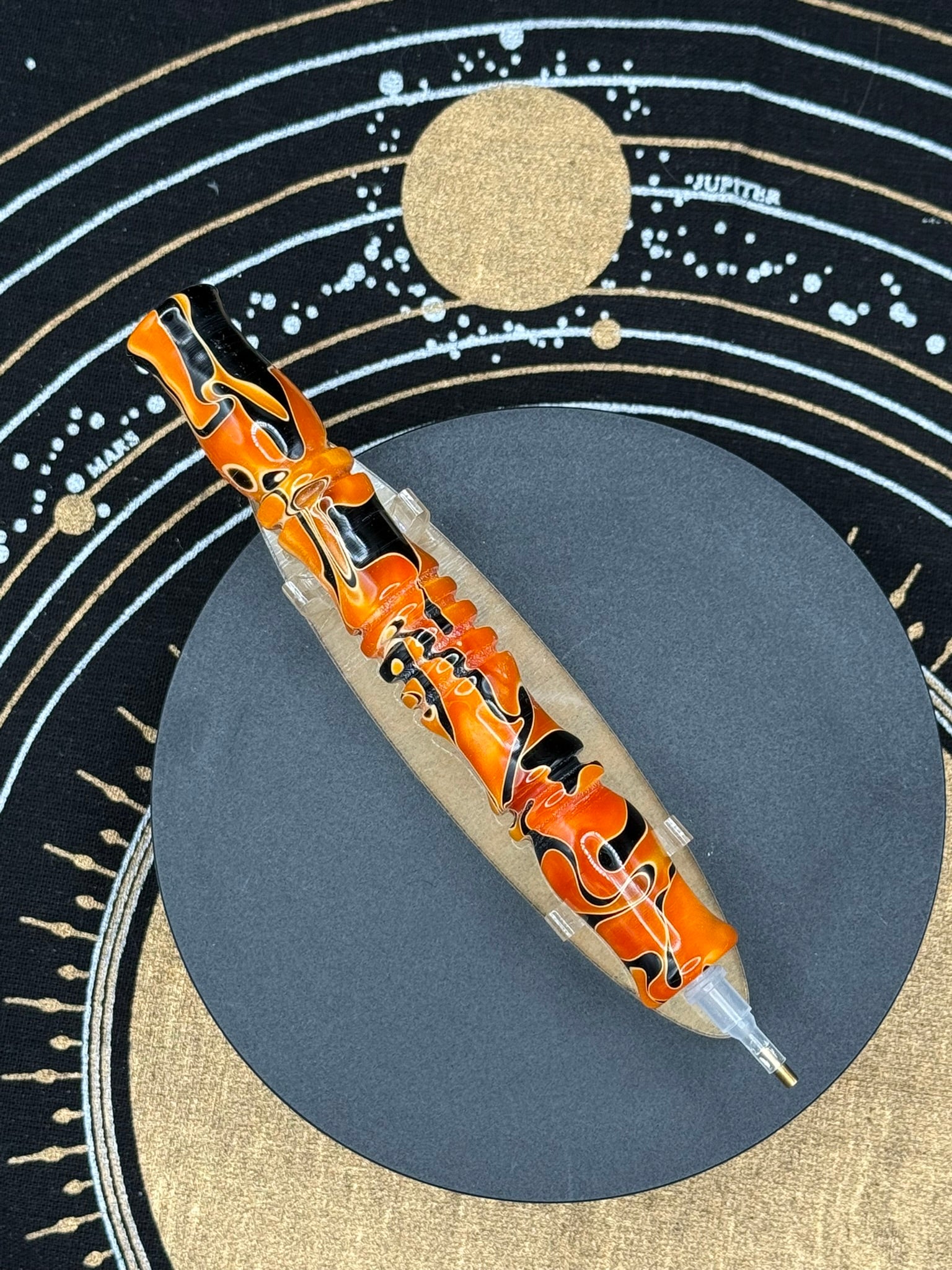 This beautiful pen is an acrylic pen in orange, black, and some yellow, is called All Hollow's Eve. It is approximately 5 inches in length. This pen comes in a green velvet pouch, with a tool kit that includes a single place tip, a bent single placer tip, a four-placer tip, and a large row straightener, all nicely placed in a box for shipping