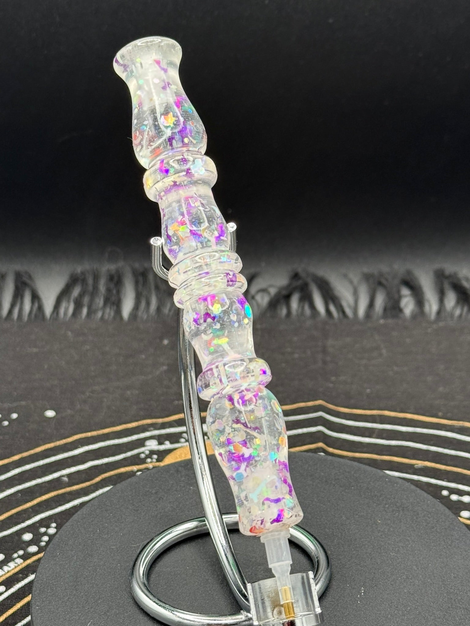 This beautiful pen is an acrylic pen is clear with bats and bones glitter. It is approximately 5 inches in length. This pen comes in a green velvet pouch, with a tool kit that includes a single place tip, a bent single placer tip, a four-placer tip, and a large row straightener, all nicely placed in a box for shipping