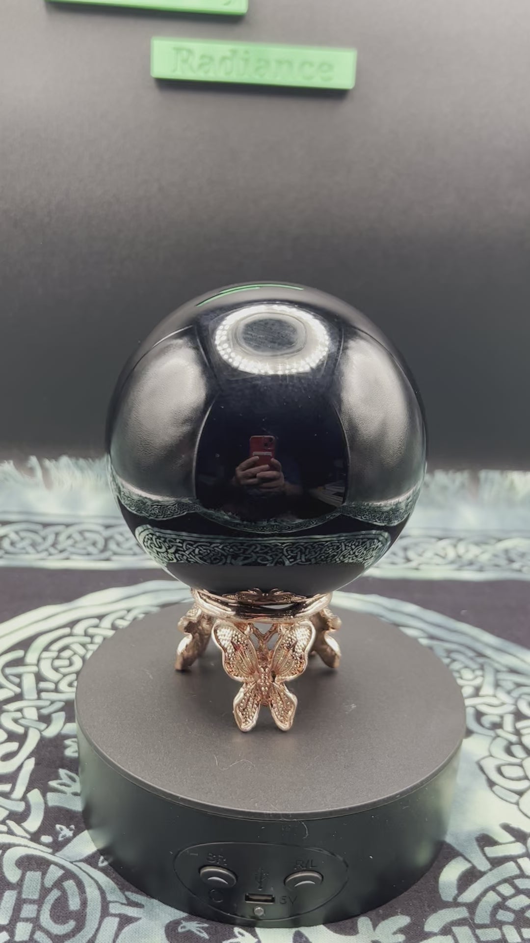 This beautiful black obsidian sphere is 8cm in diameter and weighs approximately 1.358kg.