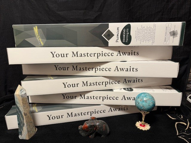 Our Diamond mystery box will greet you with (6) Beautiful Diamond Paintings in both round and square drills (while supplies last). Kit sizes starts at 50X64 cm and go up to 120X60 cm. You will also receive an amazing hand turned diamond painting pen or Crystal Gemstones. (These are NOT Mystery Diamond Paintings)