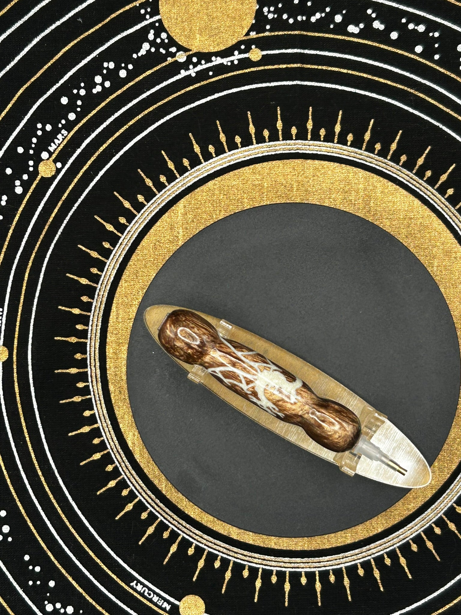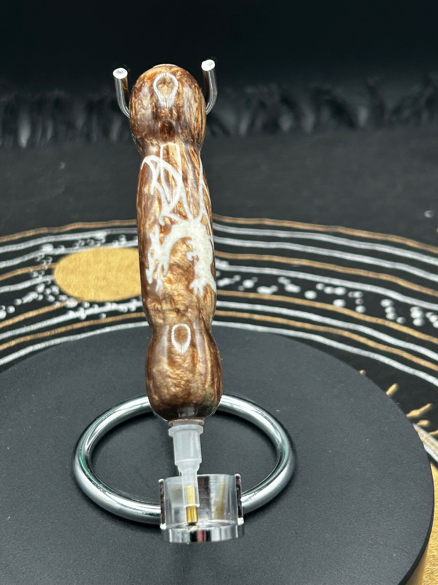 This beautiful pen is an acrylic mini pen in gold color with a white flying dragon. It is approximately 2.5 inches in length. This pen comes in a green velvet pouch, with a tool kit that includes a single place tip, a bent single placer tip, a four-placer tip, and a large row straightener, all nicely placed in a box for shipping