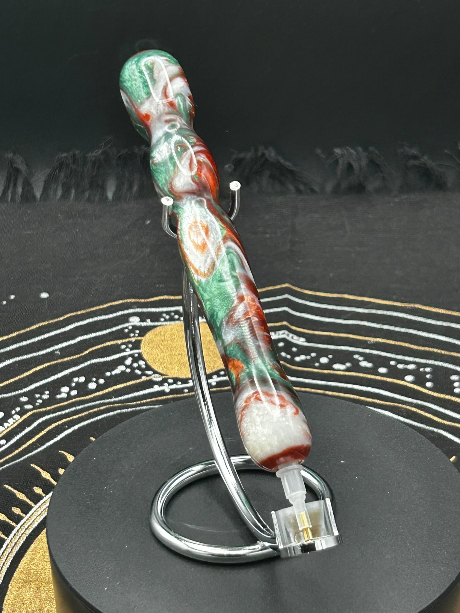This beautiful pen is an acrylic pen in a green, red, and white swirls. It is approximately 5 inches in length. This pen comes in a green velvet pouch, with a tool kit that includes a single place tip, a bent single placer tip, a four-placer tip, and a large row straightener, all nicely placed in a box for shipping