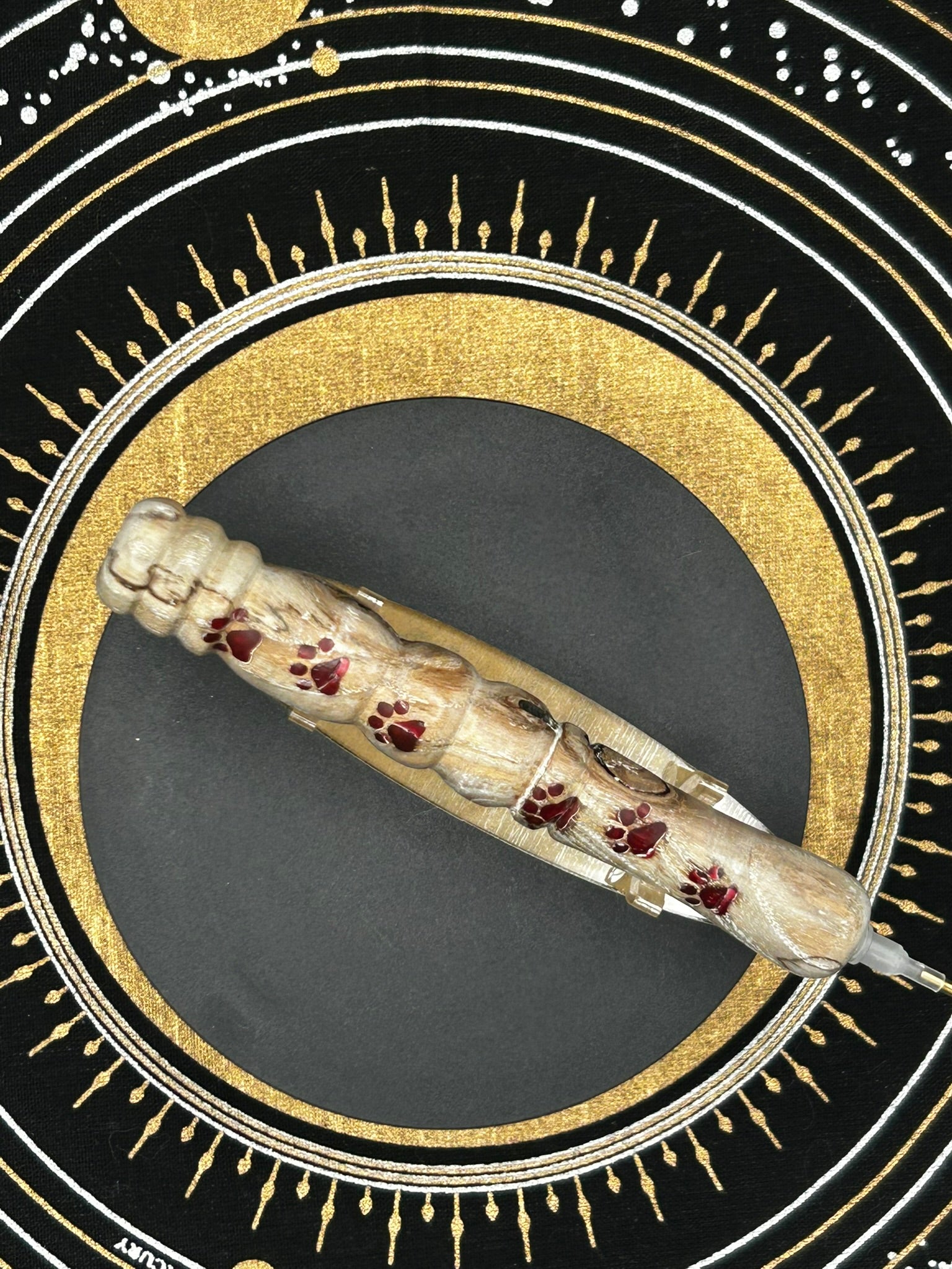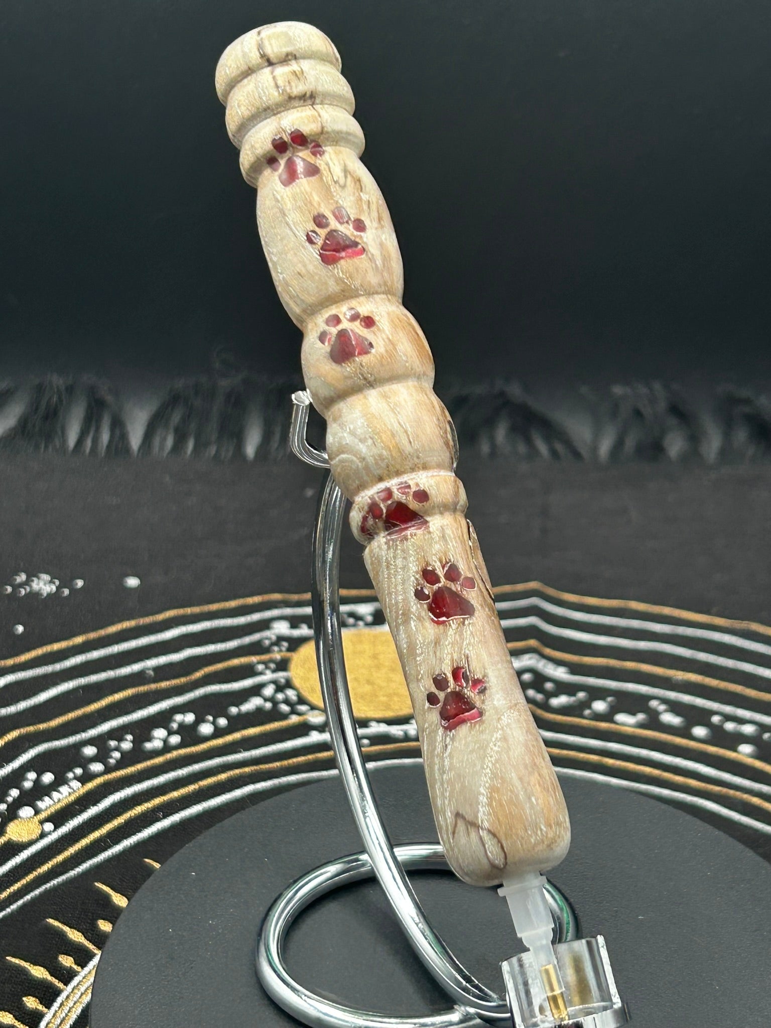 This beautiful pen is a maple wood with red acrylic paw prints. It is approximately 5 inches in length. This pen comes in a green velvet pouch, with a tool kit that includes a single place tip, a bent single placer tip, a four-placer tip, and a large row straightener, all nicely placed in a box for shipping