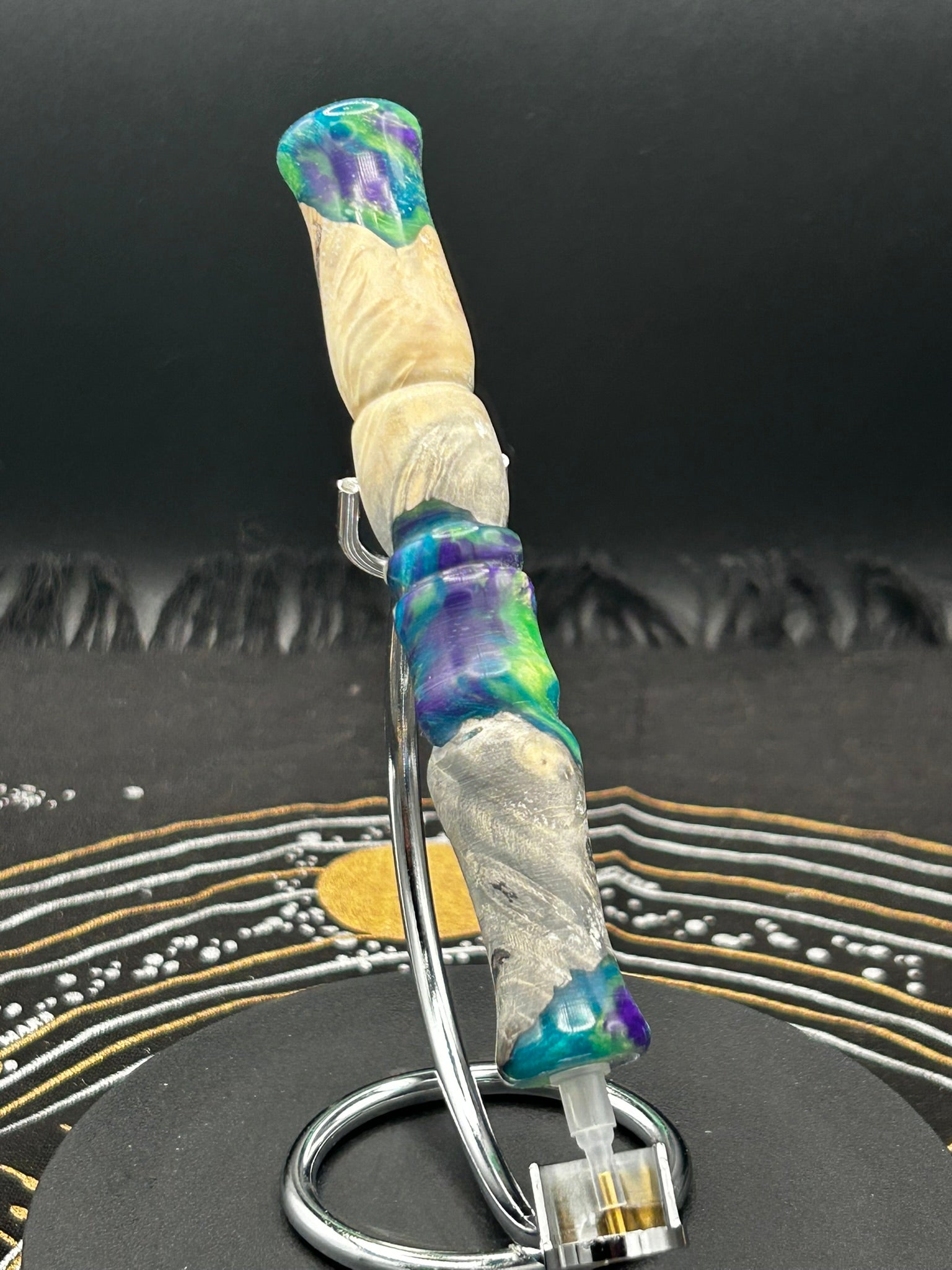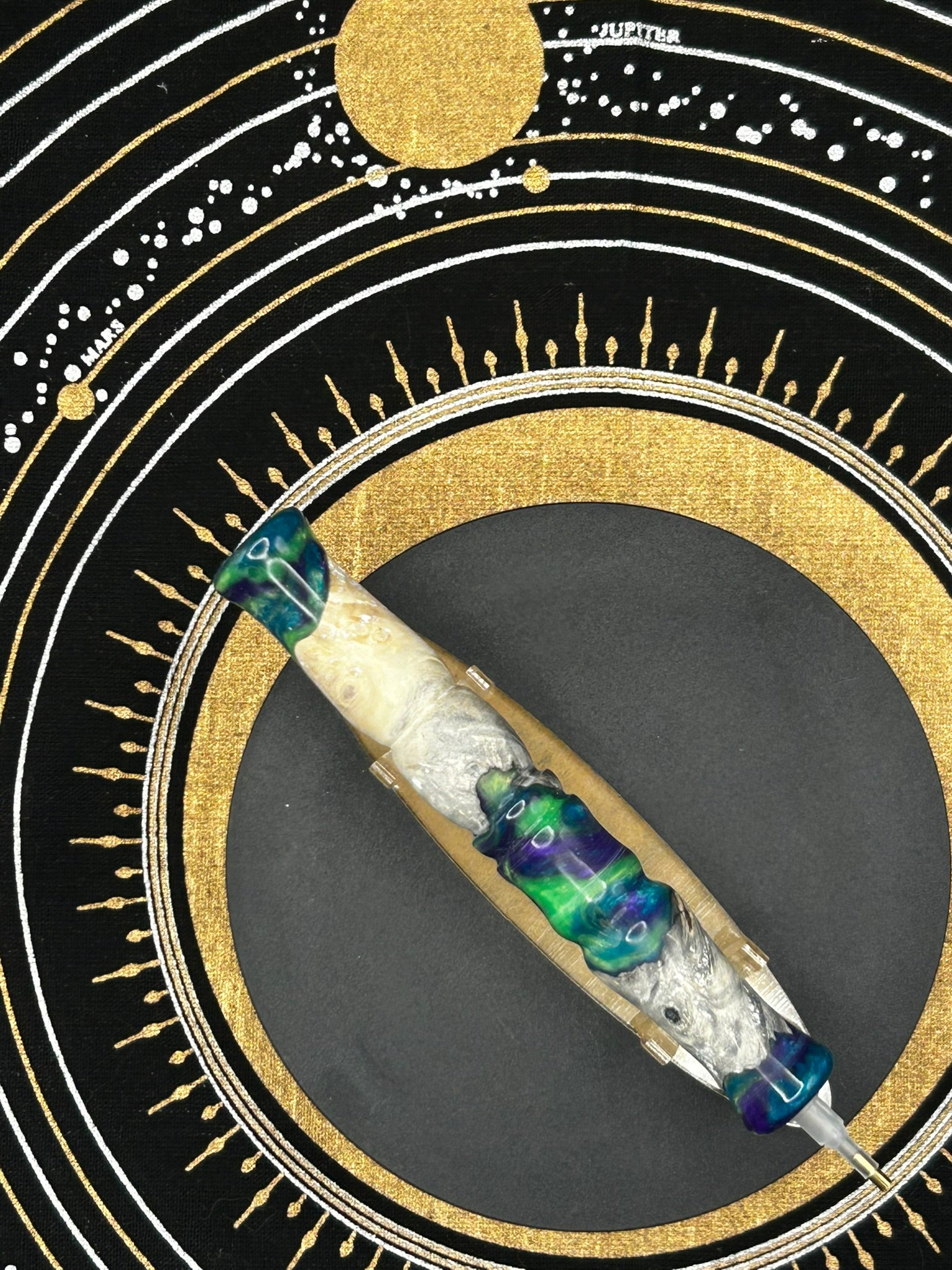 This beautiful pen is an acrylic/buckeye hybrid is of blues and green swirl acrylic. It is approximately 5 inches in length. This pen comes in a green velvet pouch, with a tool kit that includes a single place tip, a bent single placer tip, a four-placer tip, and a large row straightener, all nicely placed in a box for shipping