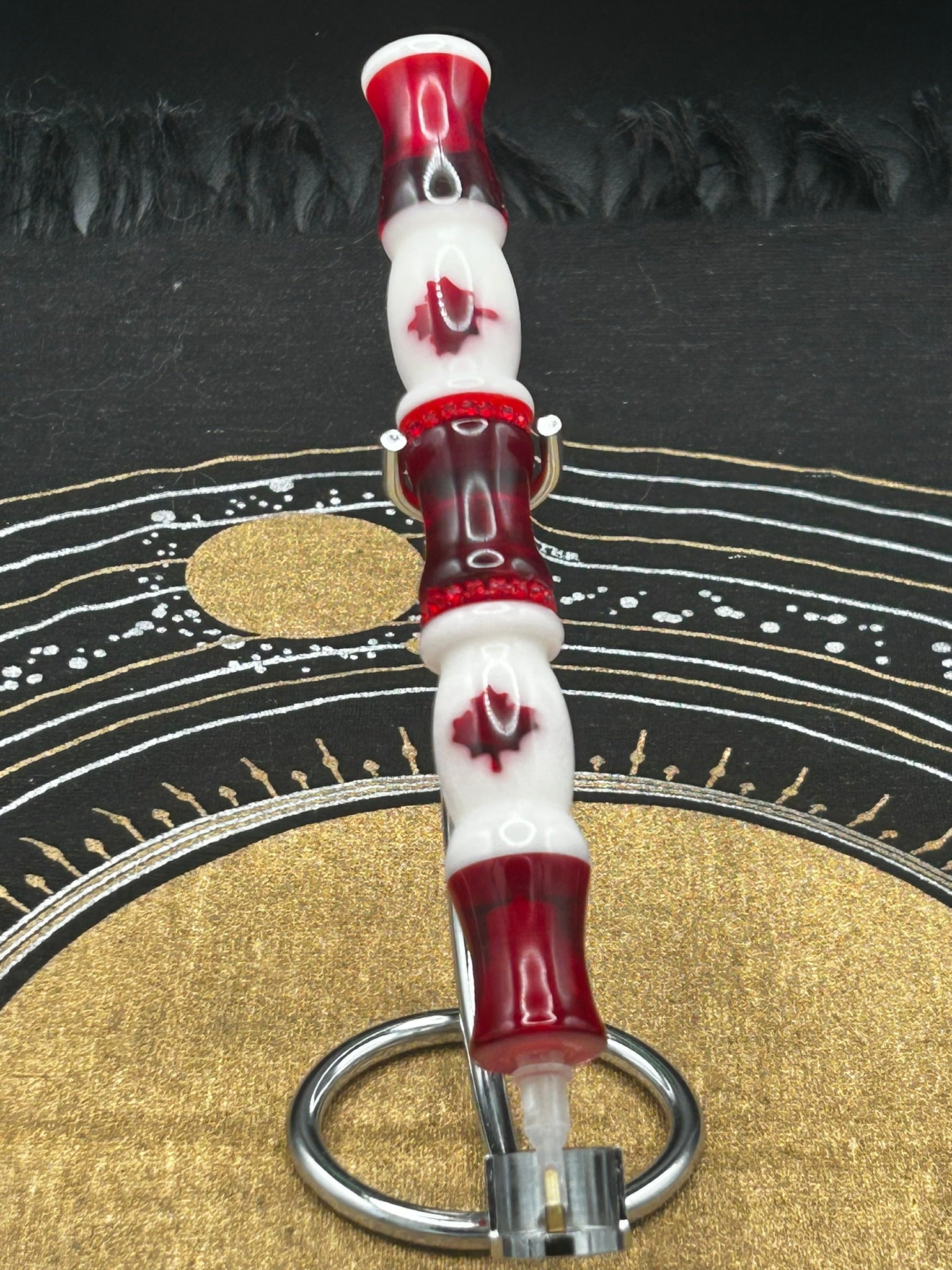 This beautiful pen is an acrylic pen in a red and white with the Canadian maple leaf. The red is a clear red and does have two rows of red gems. It is approximately 5 inches in length. This pen comes in a green velvet pouch, with a tool kit that includes a single place tip, a bent single placer tip, a four-placer tip, and a large row straightener, all nicely placed in a box for shipping
