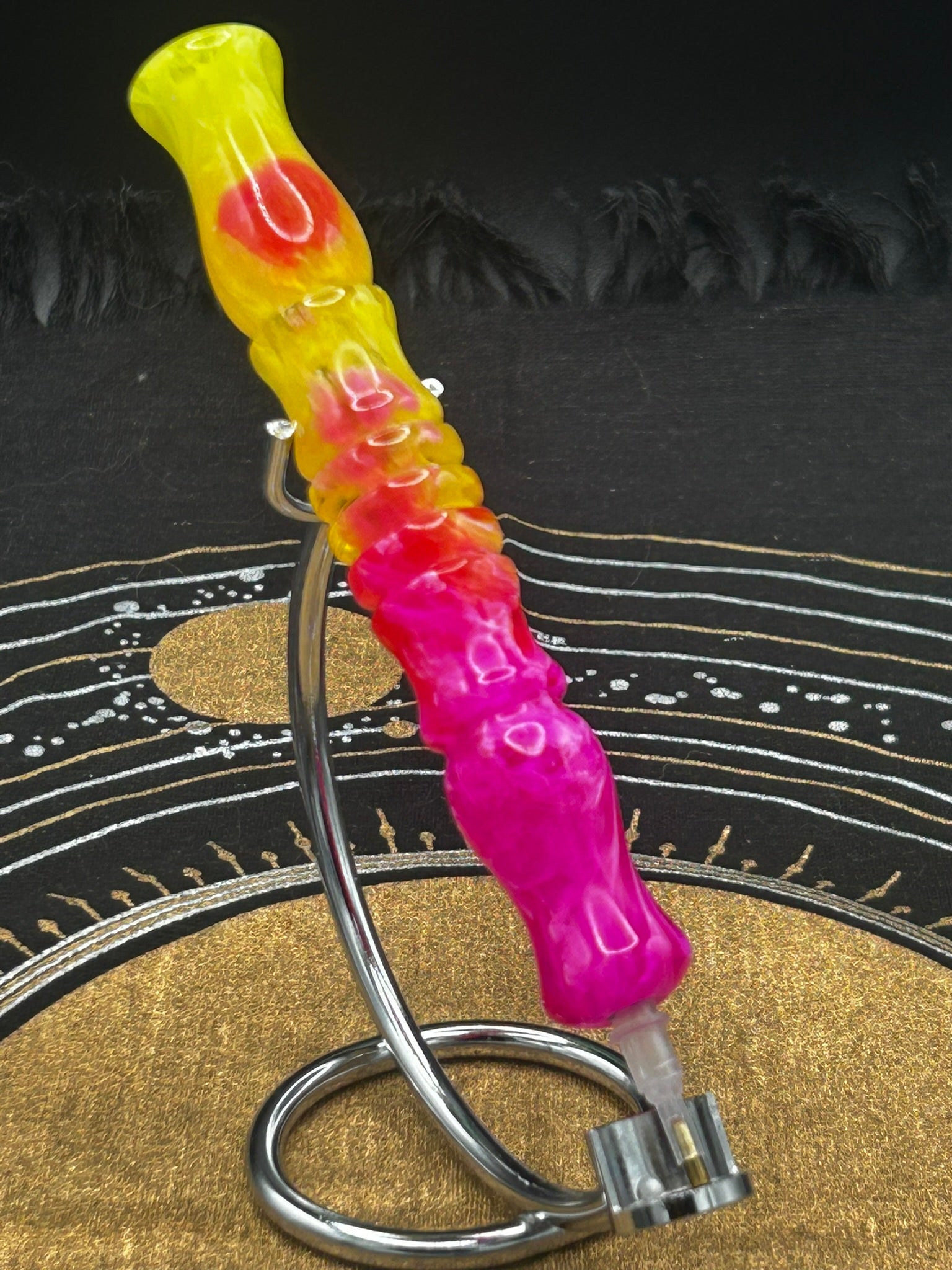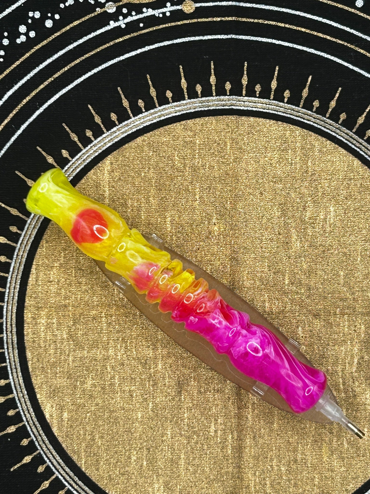 This beautiful pen is an acrylic pen in a lemon yellow and pink swirls. It is approximately 5 inches in length. This pen comes in a green velvet pouch, with a tool kit that includes a single place tip, a bent single placer tip, a four-placer tip, and a large row straightener, all nicely placed in a box for shipping