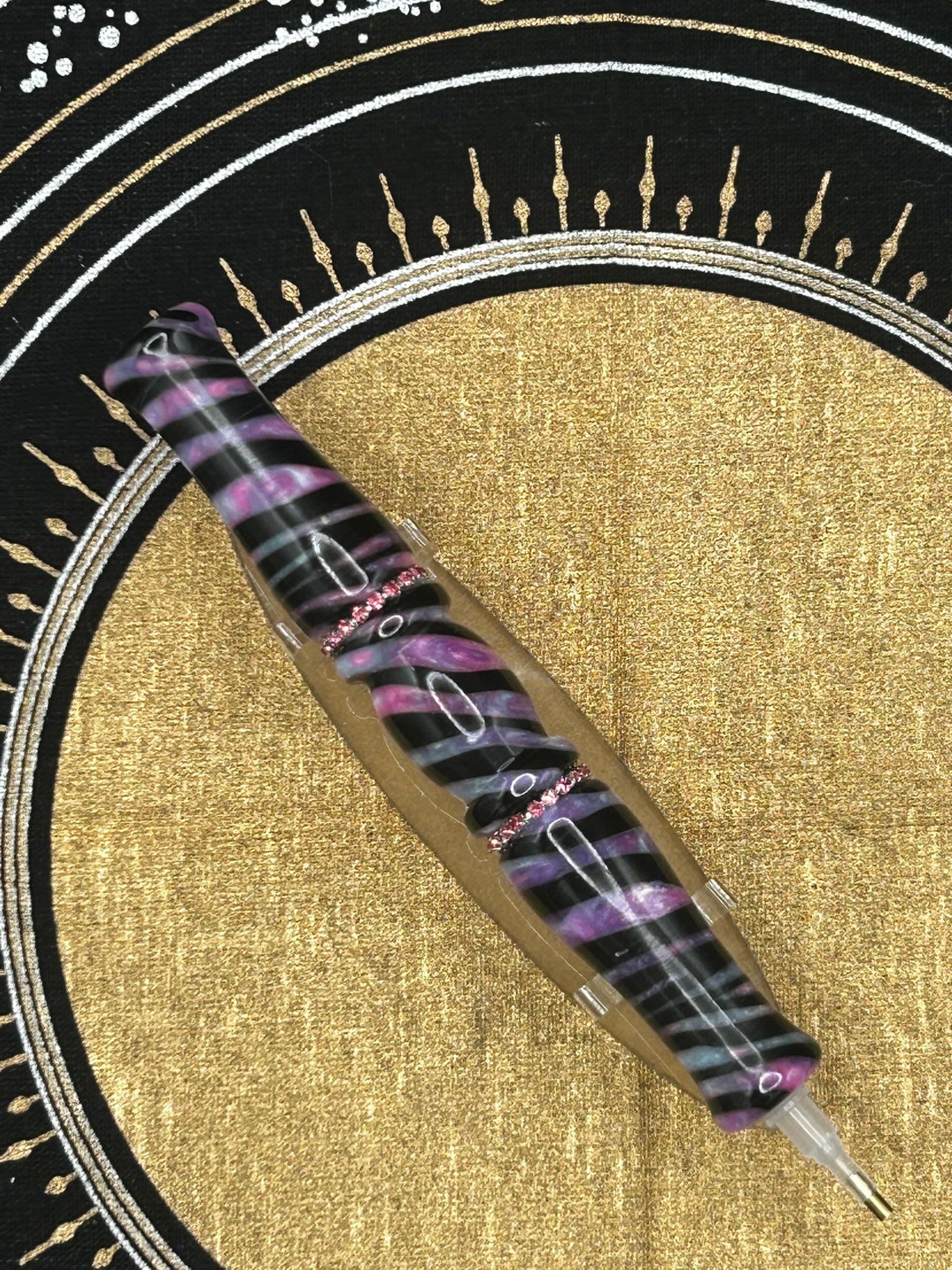 This beautiful pen is an acrylic pen in a purple tiger stripes. It is approximately 5 inches in length. This pen comes in a green velvet pouch, with a tool kit that includes a single place tip, a bent single placer tip, a four-placer tip, and a large row straightener, all nicely placed in a box for shipping