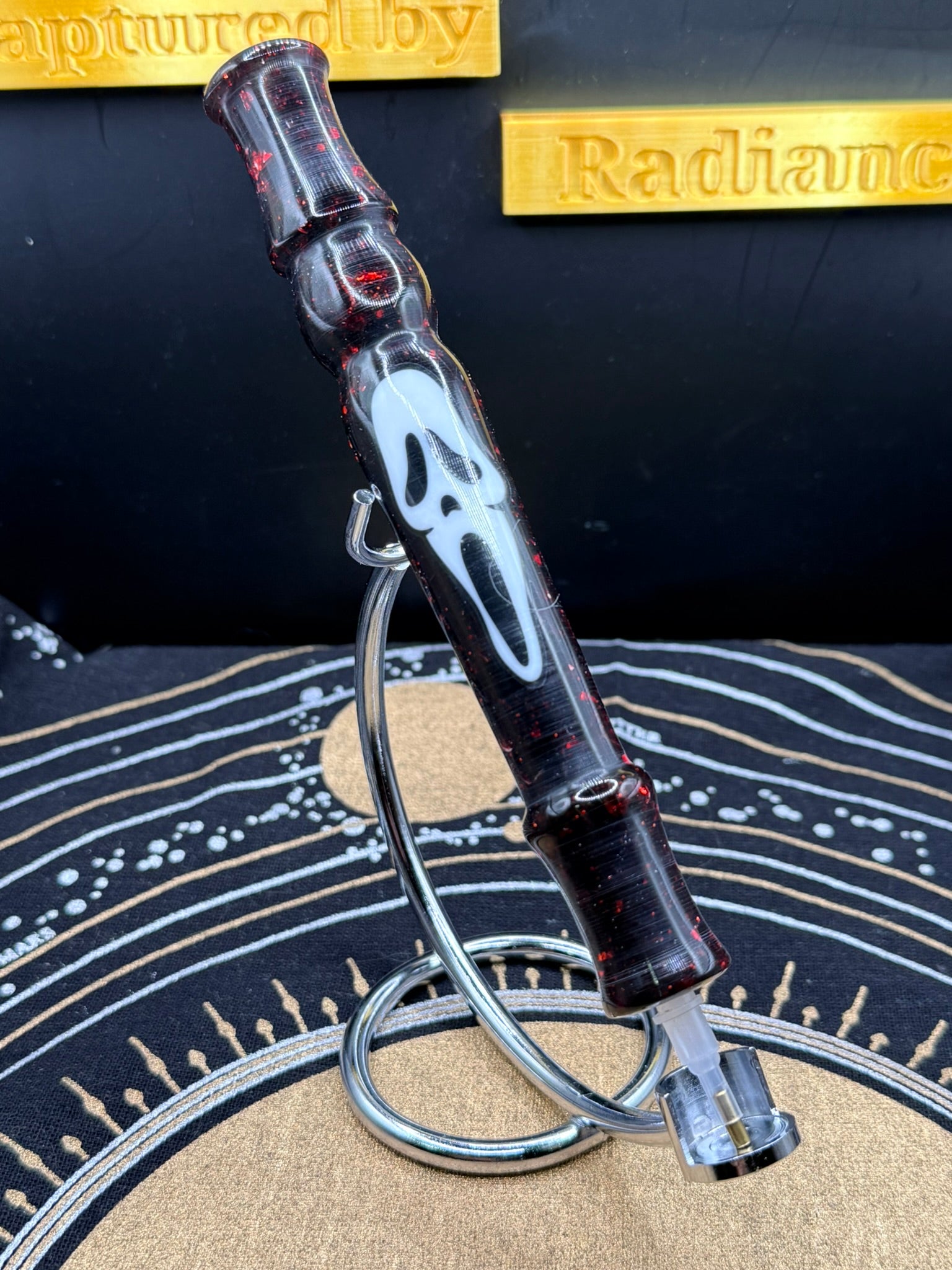 This beautiful pen is an acrylic pen is red with the iconic scream mask. It is approximately 5 inches in length. This pen comes in a green velvet pouch, with a tool kit that includes a single place tip, a bent single placer tip, a four-placer tip, and a large row straightener, all nicely placed in a box for shipping