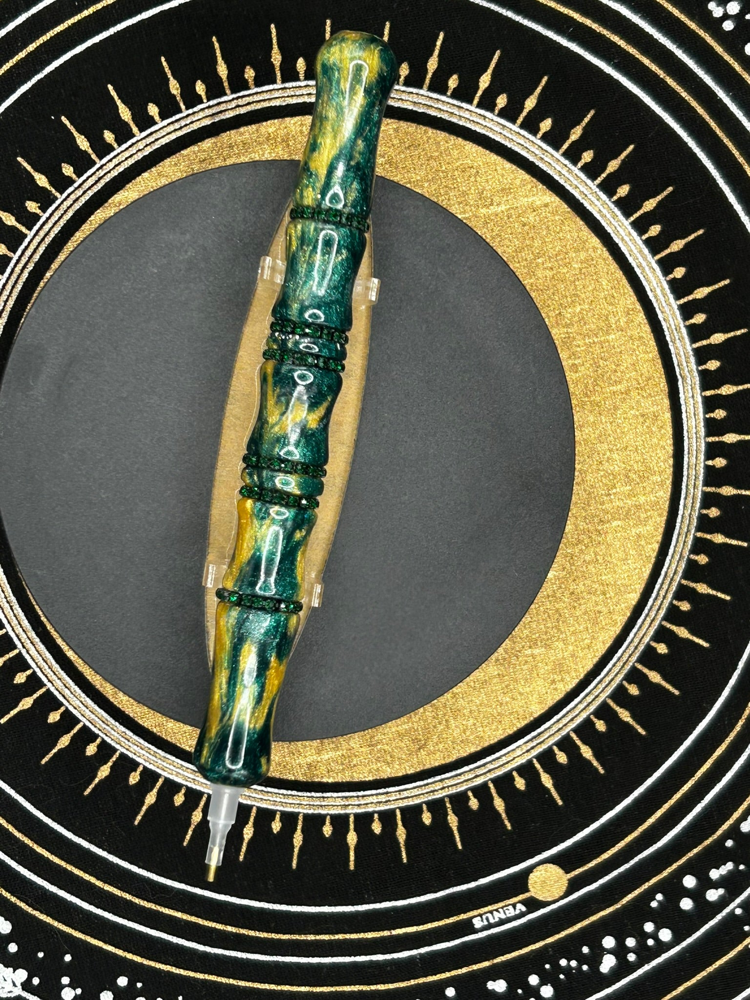 This beautiful pen is an acrylic pen in a greens and gold diamond cast swirls. It is approximately 6 inches in length. This pen comes in a green velvet pouch, with a tool kit that includes a single place tip, a bent single placer tip, a four-placer tip, and a large row straightener, all nicely placed in a box for shipping