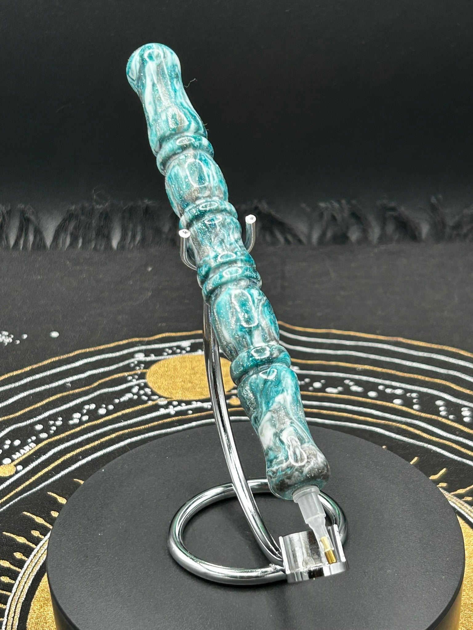 This beautiful pen is an acrylic pen in a green, grey, and silver diamond cast swirls. It is approximately 6 inches in length. This pen comes in a green velvet pouch, with a tool kit that includes a single place tip, a bent single placer tip, a four-placer tip, and a large row straightener, all nicely placed in a box for shipping