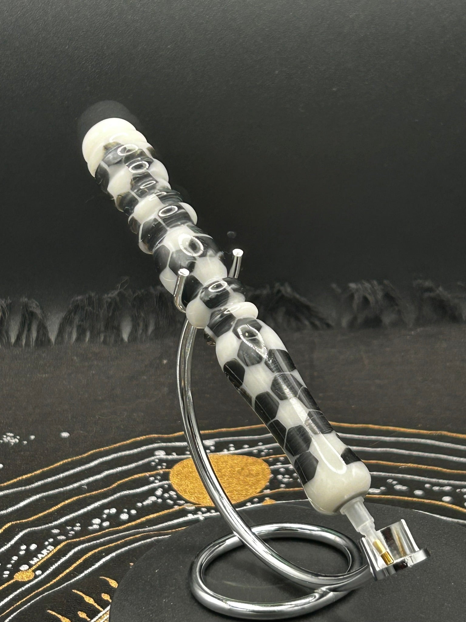 This beautiful pen is an acrylic pen is in the colors of a soccer ball, black and white. It is approximately 5 inches in length. This pen comes in a green velvet pouch, with a tool kit that includes a single place tip, a bent single placer tip, a four-placer tip, and a large row straightener, all nicely placed in a box for shipping