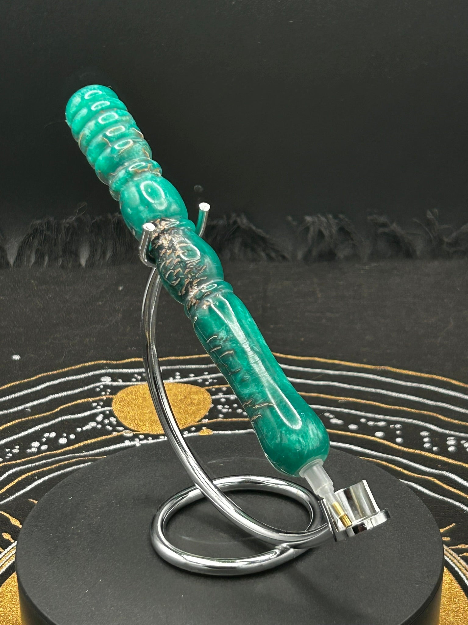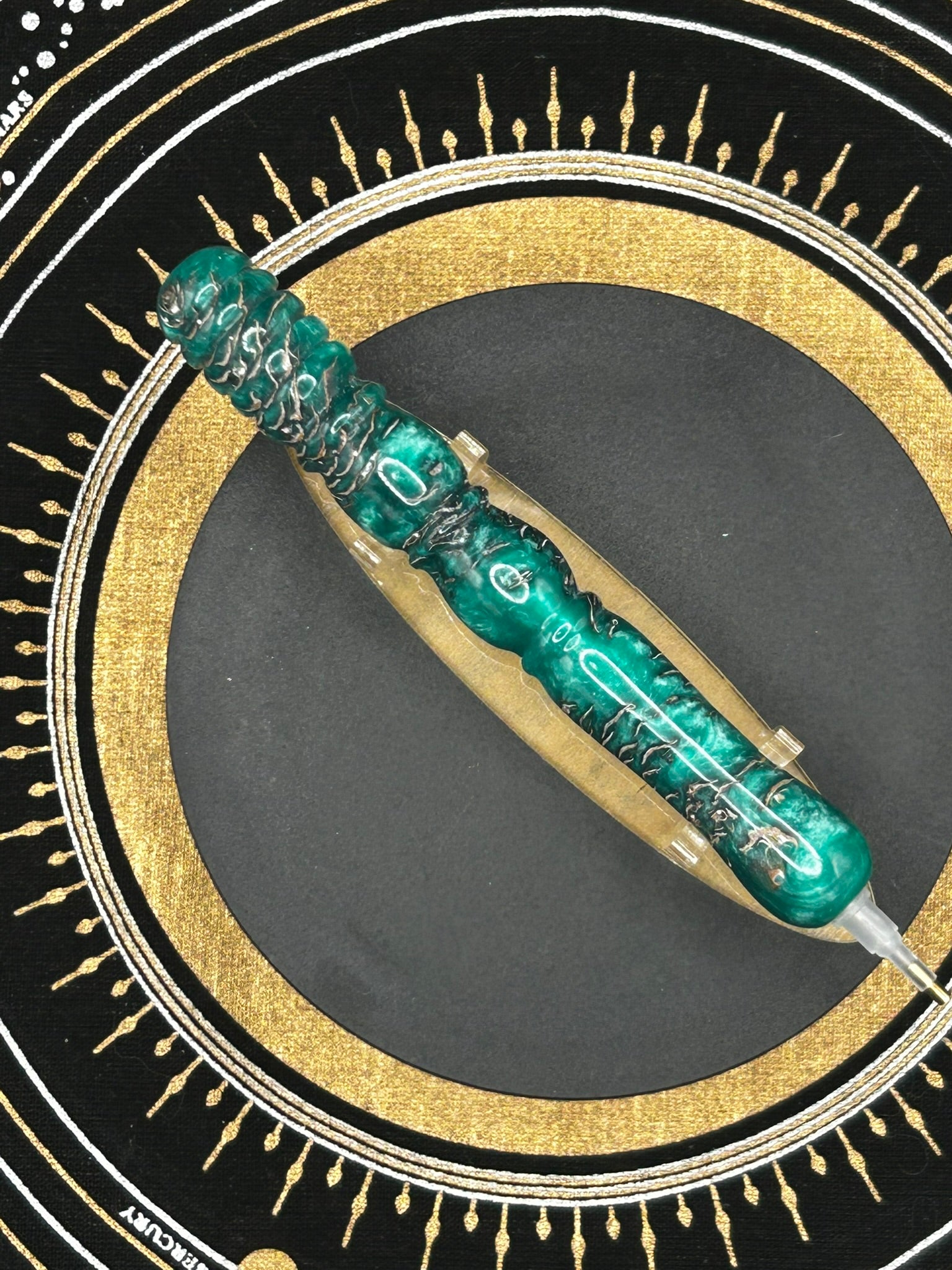 This beautiful pen is teal in color with pinecone. It is approximately 5 inches in length. This pen comes in a green velvet pouch, with a tool kit that includes a single place tip, a bent single placer tip, a four-placer tip, and a large row straightener, all nicely placed in a box for shipping