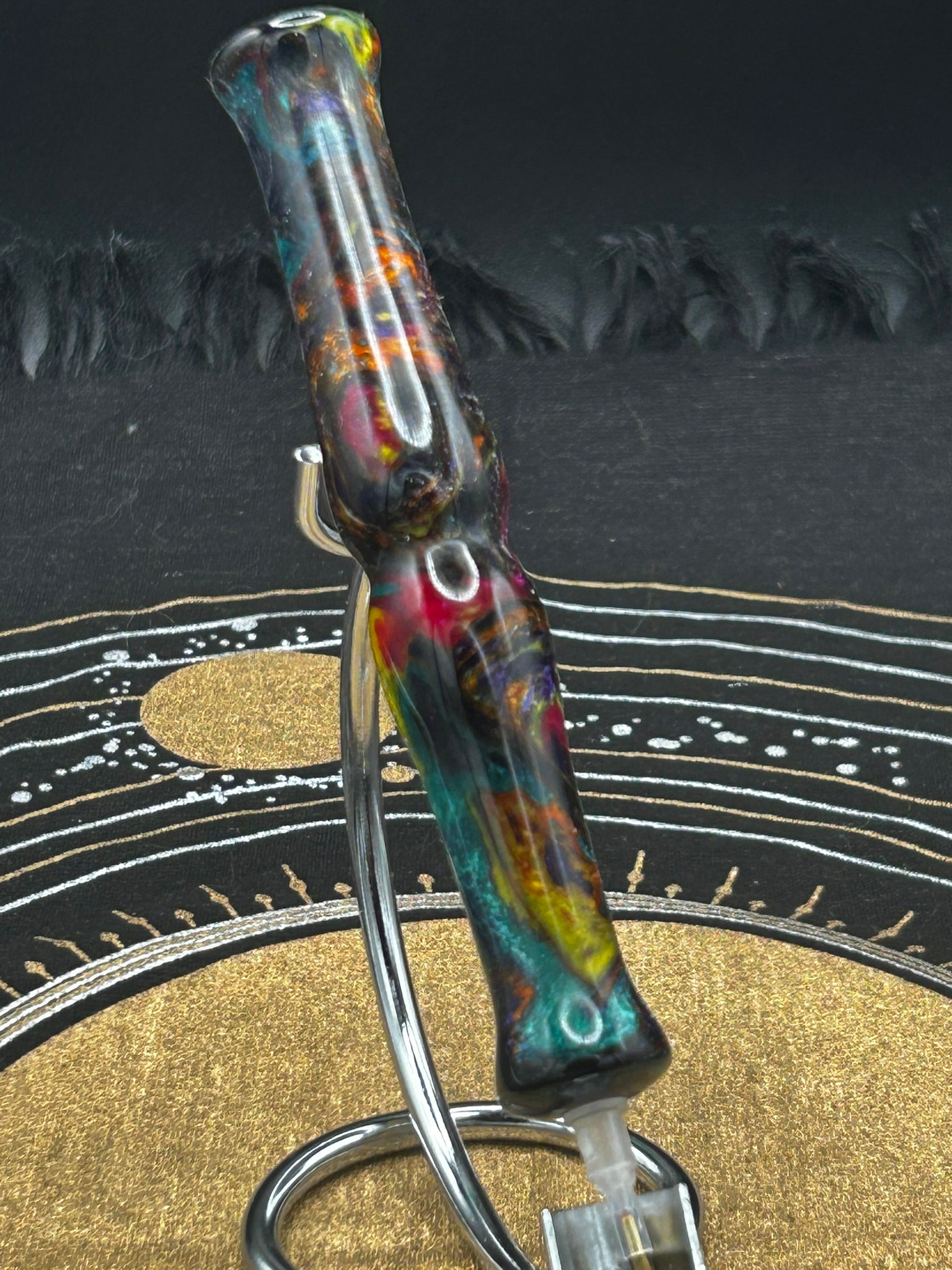 This beautiful pen is an acrylic pen in a green, red, yellow, orange swirls. It is approximately 5 inches in length. This pen comes in a green velvet pouch, with a tool kit that includes a single place tip, a bent single placer tip, a four-placer tip, and a large row straightener, all nicely placed in a box for shipping