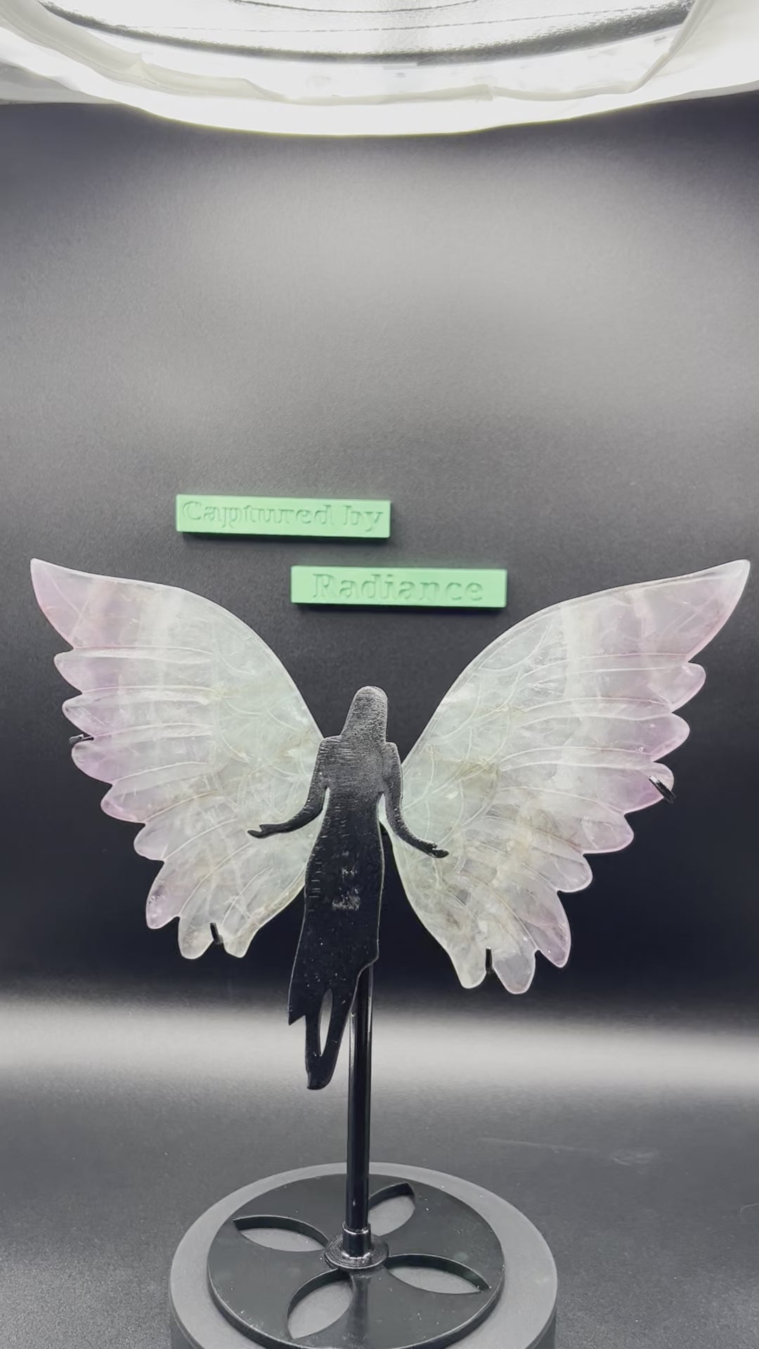 These wings are classified as Watermelon Fluorite. Thes wings come with the stand as shown to represent a fairy. The wings are approximately 6 inches in length, and 3 inches in width.