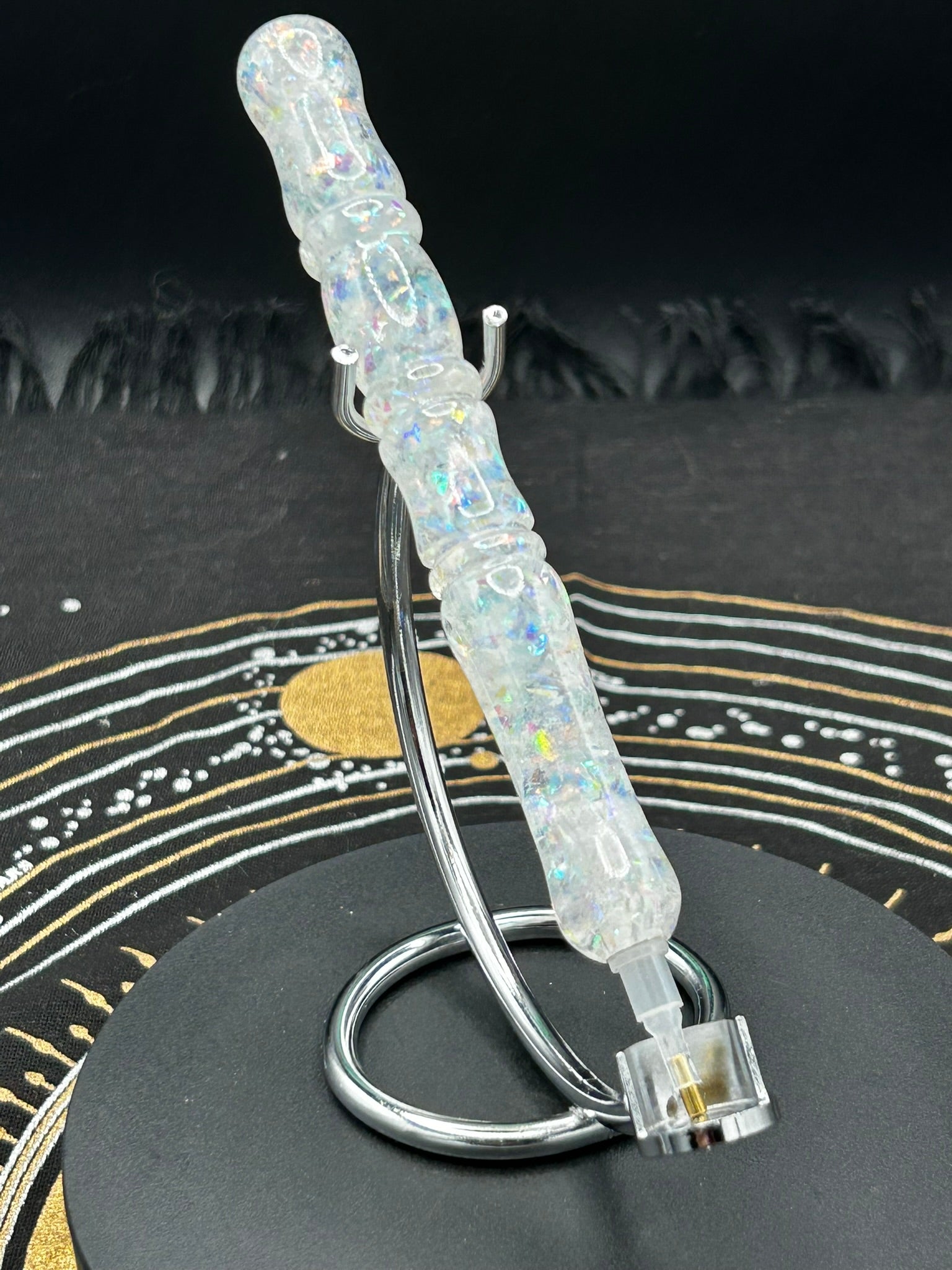This beautiful pen is an acrylic pen in a clear white glitter. It is approximately 5 inches in length. This pen comes in a green velvet pouch, with a tool kit that includes a single place tip, a bent single placer tip, a four-placer tip, and a large row straightener, all nicely placed in a box for shipping