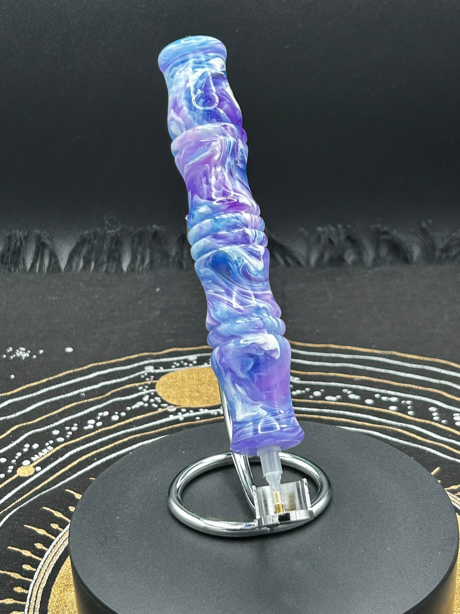 This beautiful pen is an acrylic pen in a sky blue, lilac, and white swirls. This pen is a little chunky. It is approximately 5 inches in length. This pen comes in a green velvet pouch, with a tool kit that includes a single place tip, a bent single placer tip, a four-placer tip, and a large row straightener, all nicely placed in a box for shipping